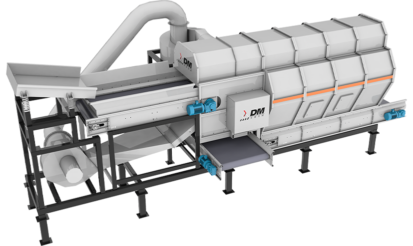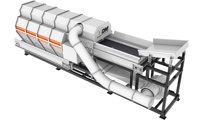 Unidad de separación crítica en el procesamiento de residuos sólidos urbanos, que aísla eficazmente los materiales ligeros (plásticos, espuma, restos de papel) de las fracciones densas para garantizar la pureza de los componentes pesados. Funciona según principios aerodinámicos que separan los materiales por diferencia de densidad.
